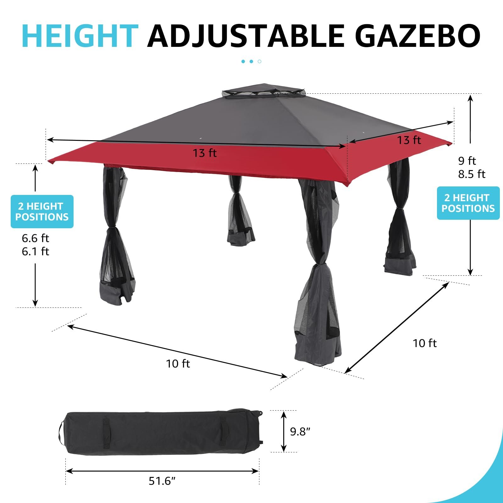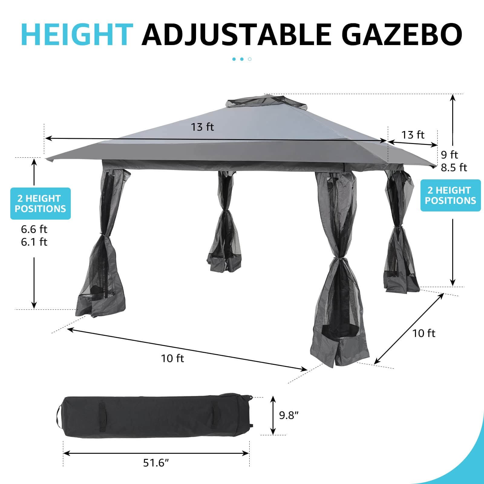 - Durable & Height Adjustable-Made of powder-coated steel frame and UV-protected 210D waterproof Oxford fabric, the outdoor pop-up gazebo tent is for all-weather use. Also, this patio shelter gazebo’s height can be adjusted in 2 positions, you can choose the height according to your need