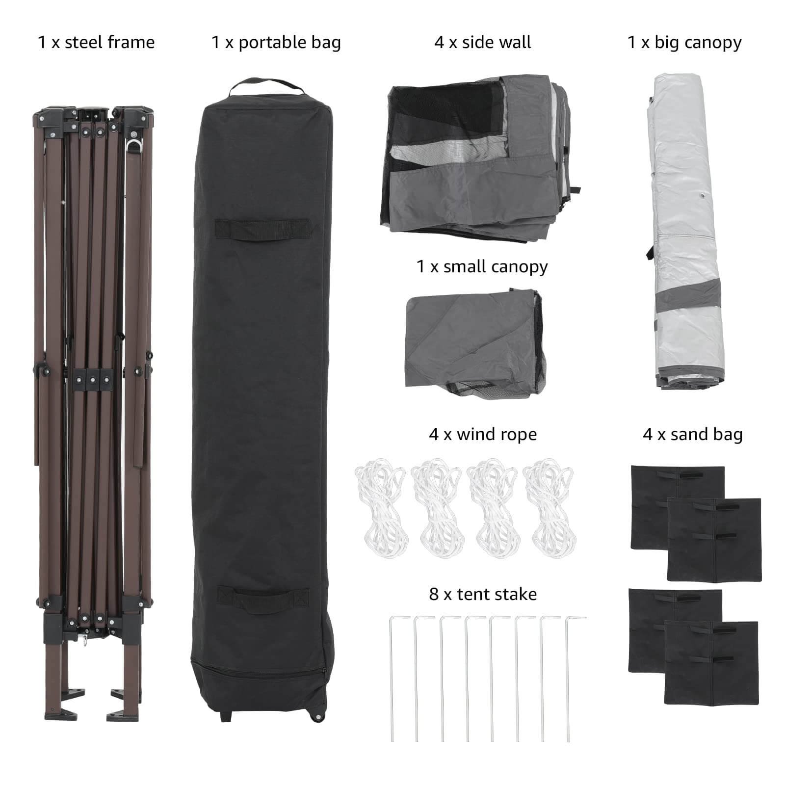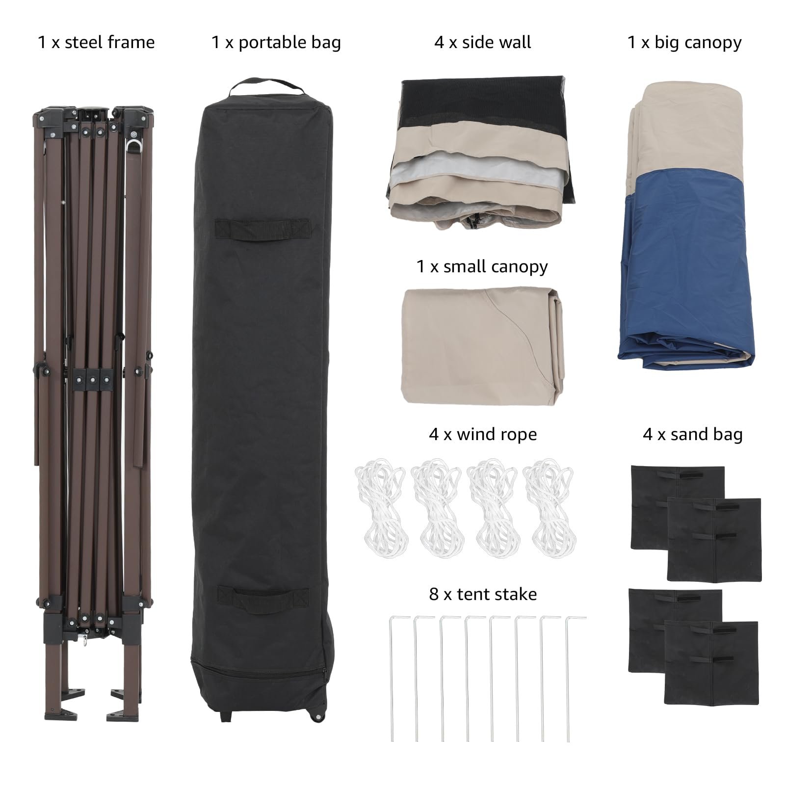 | Size | 10’x10’ straight leg frame and 13’x13’ large canopy |