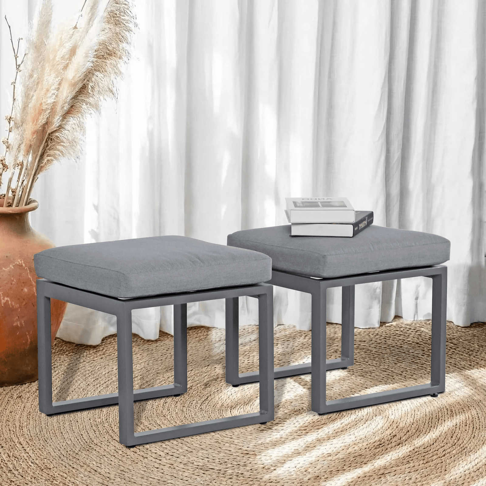 - DURABLE MATERIAL– Made of an all-weather-resistant aluminum frame, the square ottoman is lightweight but can hold a stable structure to ensure years of service life. Included seat cushions which are covered with olefin fabric have zippers for easy cleaning.